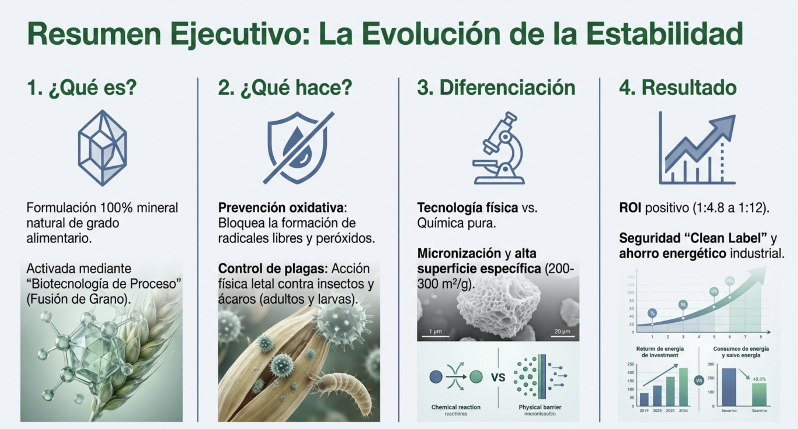 Esta solución no es solo un conservante; es un sistema de protección integral que previene la rancidez oxidativa, controla plagas (insectos y ácaros) y optimiza los costes de producción industrial, garantizando un retorno de inversión (ROI) superior a los estándares del mercado