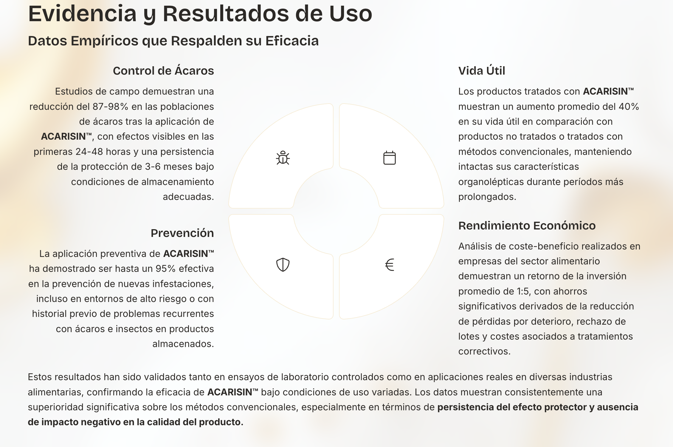 A diferencia de otros productos que abordan aspectos parciales del problema, ACARISIN™ y ECO-EFF™ ofrecen: