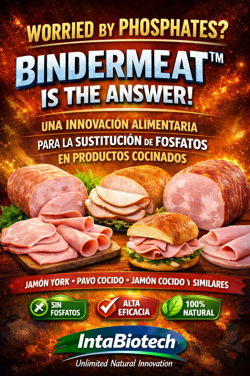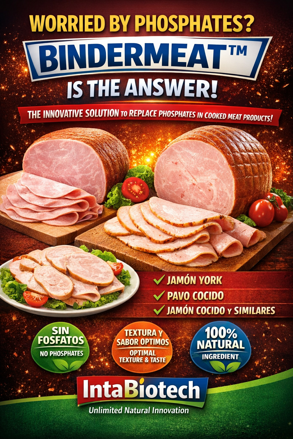 La sustitución de fosfatos en procesados cárnicos es un reto tecnológico porque estos compuestos aportan retención de agua, estabilización de emulsiones, mejora de cohesión y control de pérdidas por cocción. BINDERMeat™ se propone como alternativa “clean label”, con formatos adaptados a procesos de tumbling/masajeado e inyección, procurando no alterar el proceso del cliente.